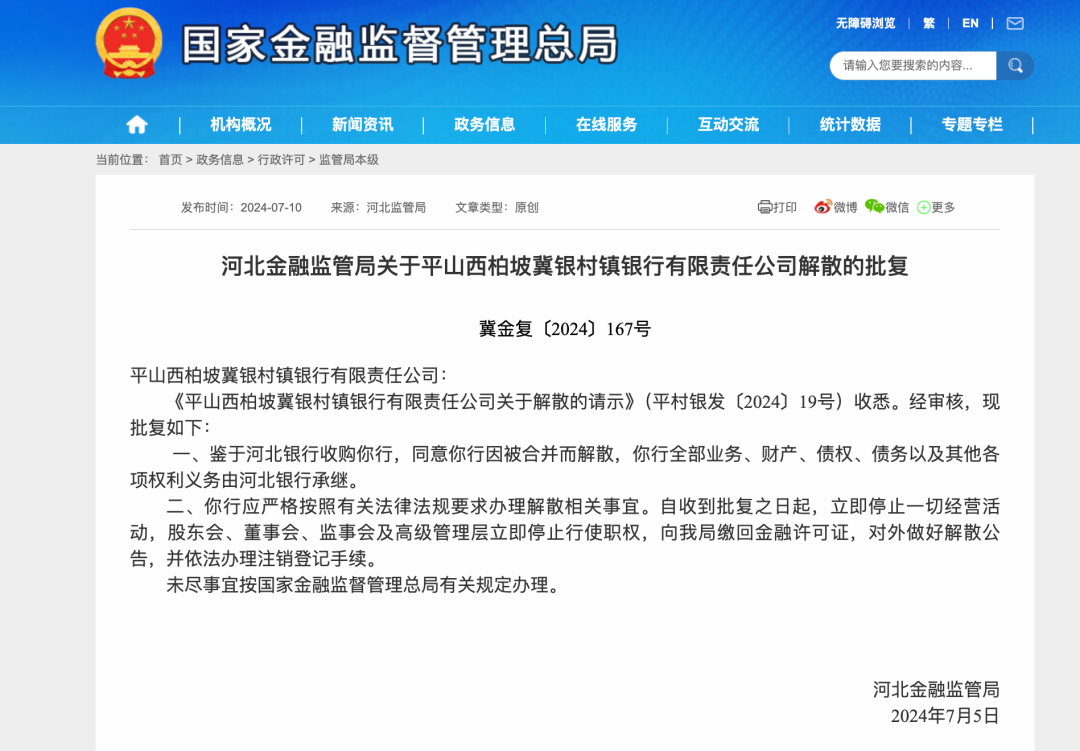 7月10日,金融监管总局官网披露的行政许可信息显示,平山西柏坡冀银村镇银行已于日前获批解散。
